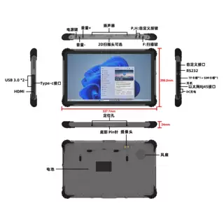 大屏幕13.3寸的三防平板,CPU可以选配 RK3588、N5100、12代I5 12代 I7 ,内存 8+256、16+256 等内存 系统配备的是 安卓12或WINDOWS系统, 接口方面配SIM卡 和T卡及 TYPEC USB3.0 HDMI DC充电口,可以扩展 RS232 RJ45。