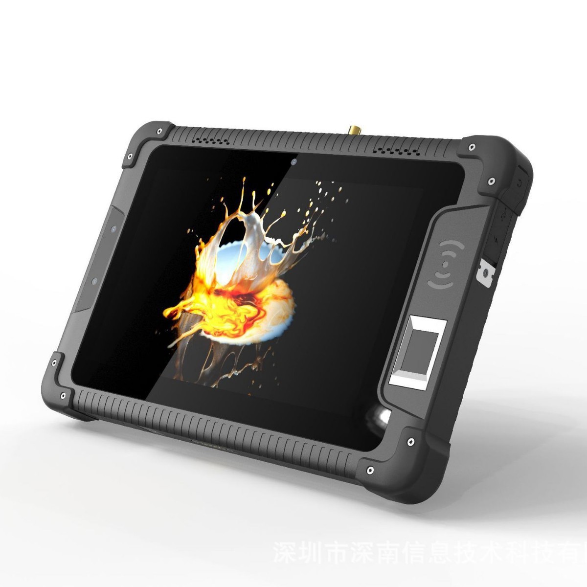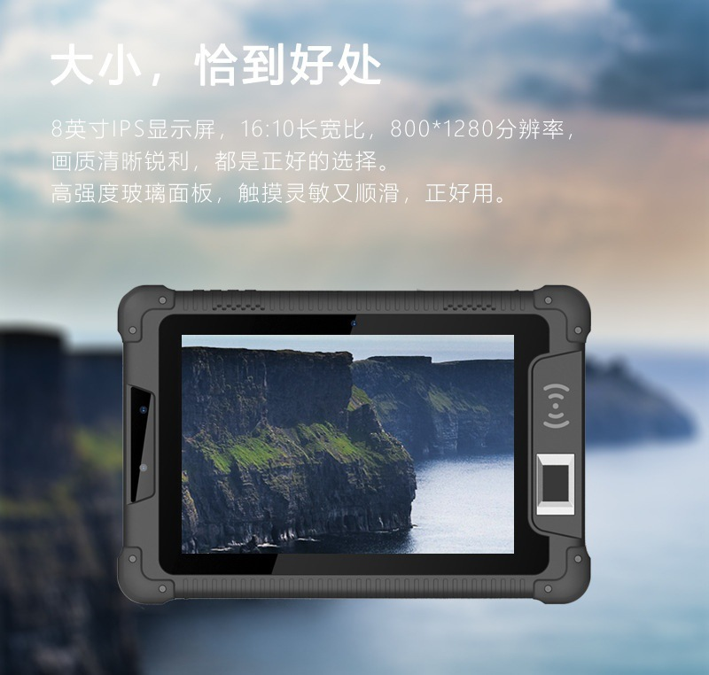一款性价比高的三防智能工业平板电脑,8寸版本,内存硬盘 4G+64GB, 8G+128GB 12G+256G 标配安卓系统,自带4G ,蓝牙 WIFI,并且拥有丰富的接口,接口主要配置 RJ45网口,USBA2.0接口,RS232接口,TYPEC接口HDMI接口,DC充电口,及还可以改制航插接口,平板功能方面可以选配 身份证模块识别,指纹识别,超高频RFID模块,低频模块, LORA模块 NFC等,背面有标准的 VESA孔可以固定。