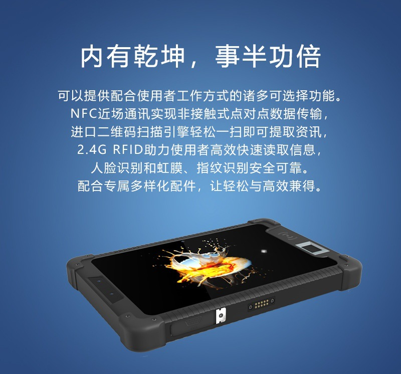 一款性价比高的三防智能工业平板电脑,8寸版本,内存硬盘 4G+64GB, 8G+128GB 12G+256G 标配安卓系统,自带4G ,蓝牙 WIFI,并且拥有丰富的接口,接口主要配置 RJ45网口,USBA2.0接口,RS232接口,TYPEC接口HDMI接口,DC充电口,及还可以改制航插接口,平板功能方面可以选配 身份证模块识别,指纹识别,超高频RFID模块,低频模块, LORA模块 NFC等,背面有标准的 VESA孔可以固定。